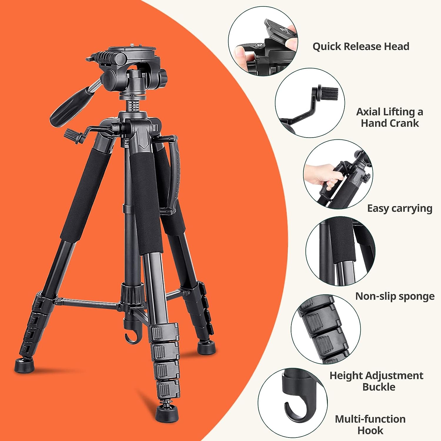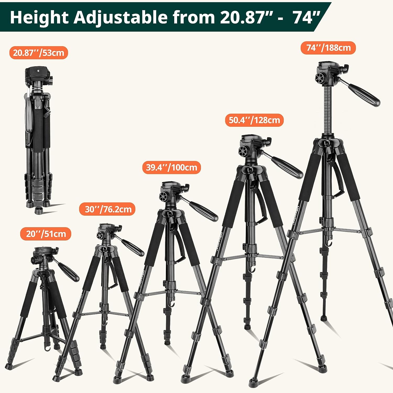 【Wide Compatibility】This camera tripod has a sturdy phone holder and 1/4 Universal Screw. And it can extend from 20.87 to 74in, this tripod fully for All Cameras(Nikon D3500/D7500, Canon m50 EOS rebel t6 t7, Olympus, Panasonic).